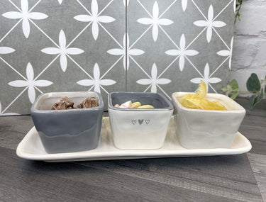 This set of 3 snack dishes and the ceramic tray is perfect for parties and big family dinners. In cream and grey tones with the dimple effect finish. Heart detail and spots too!