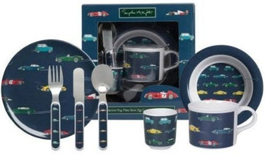 Sophie Allport Car themed seven-piece dining set includes a plate, bowl, cup, knife, fork, spoon and egg cup.