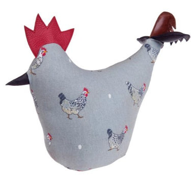 A stylish and practical addition to your home. Protect your door from banging and keep it held open with this quirky Chicken stop featuring Speckled Maran hens and some white eggs on a sage grey background. The tail and cockscomb are made from leather.