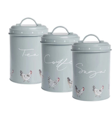 A set of 3 galvanised Chicken tins for storing your tea, coffee and sugar, keeping them fresh and looking super stylish in your kitchen.  Featuring Speckled Maran hens walking around the base of each sage grey tin, white eggs dotted around each lid and the branded font to label each tin too.