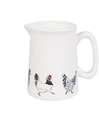 Fine bone china jug featuring four clucking hens around the base. Ideal size for milk and cream or for displaying a small flower.