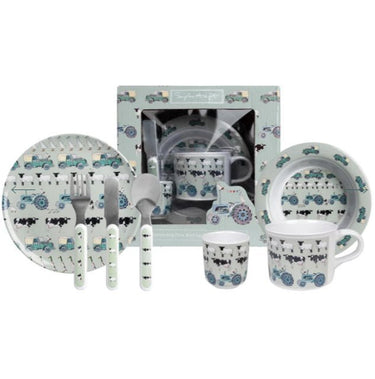 The perfect gift for any little country bumpkin's special Birthday, Christening or Birth. This seven piece dining set, in the 'On The Farm' theme, includes a plate, bowl, cup, knife, fork, spoon and little egg cup. Crafted from 100% melamine and the cutlery with plastic handles and stainless steel ends, it's the perfect full nursery dinning set, perfect for babies who are weaning and toddlers who are learning to feed themselves. Decorated with tractors, Land Rovers, sheep, cows, sheepdogs and chickens all on a green background, it's a must for any little farmers and fans on the farmyard.