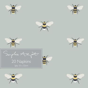 This set of 20 pretty paper napkins is covered in stylish Sophie Allport Bees design on a pale green background.