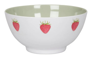 This durable bowl is perfect for picnics in the park, beach trips, BBQs and outdoor entertaining. This bowl is covered with a strawberry illustration on a white background and is light green on the inside of the bowl.