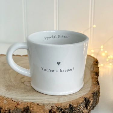 Perfect gift for those special friends! White ceramic handmade mug with grey 'You're a keeper' message and little heart. The mug has 'special friend' wording inside.