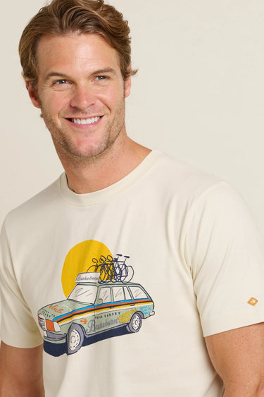 Fun, easy going and made from 100% cotton, this tee celebrates the humble road trip and adventures on the bike with friends.