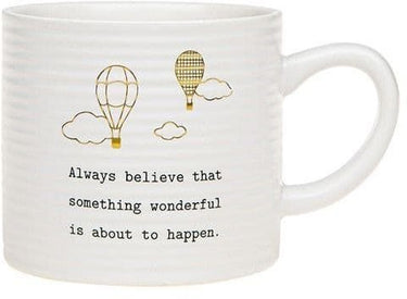 This white finely textured ceramic mug has a beautiful gold design of hot air balloons and clouds. An inspiring message in black reads: 'Always believe that something wonderful is about to happen'