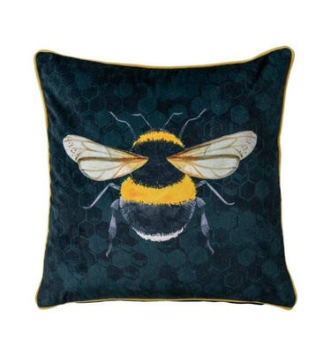 An eye-catching cushion in Emerald Green, featuring a beautiful bee on a suble honeycomb-design background. The contrast piped edging adds the finishing touch.