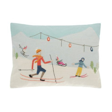 Walton & Co Ski Scene Cushion. This charming Ski Scene rectangular Cushion from Walton & Co is made from 100% cotton and hand finished with applique and embroidery detail. 30cm x 40cm