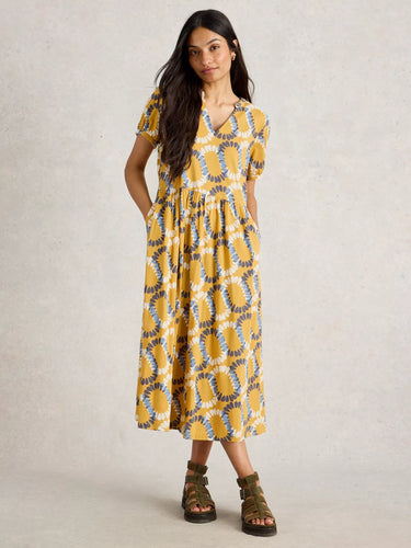 A pretty and brightly coloured midi summer dress, which look great with a pair of sandals.