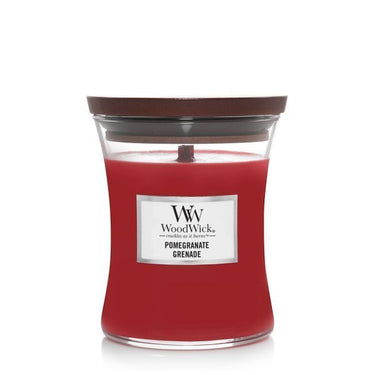The WoodWick Hourglass Candle in Pomegranate. Surround your senses with crisp, complex pomegranate notes paired with cassis, soft florals, and rich undertones of rum and musk, all whilst enjoying the crackle of the natural wooden wick.