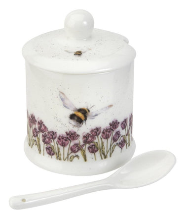 Royal Worcester Wrendale Designs Conserve Pot Bumble Bee. Crafted from fine porcelain and featuring the beautiful hand illustrations of Hannah Dale, this conserve pot and spoon is sure to bring British summertime to your breakfast table. Simply fill with your favourite jam, marmalade or honey, and enjoy! Perfect for hosting guests and practical as it's dishwasher safe too!