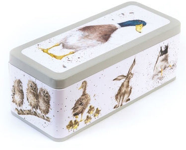 This Wrendale Designs cracker tin is illustrated beautifully with a hare, owl and duck designs on all surfaces. Finished with green edging.