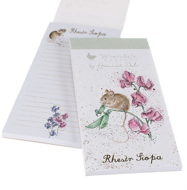 Wrendale Welsh Pea Thief Shopping Pad featuring a popular design from our 'Country Set' collection this shopping pad has a textured cover and is lined and illustrated on the inside. With a handy magnet on the back it is an  essential addition to any kitchen. 'Rhestr Siopa' in Welsh is on the cover. The perfect gift for your Welsh friend.